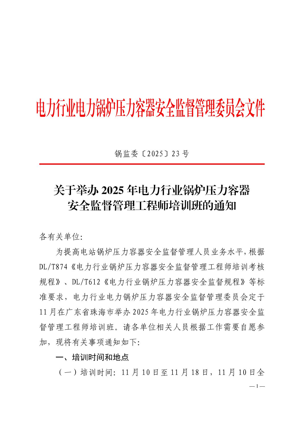 关于举办2025年电力行业锅炉压力容器安全监督管理工程师培训班的...详细